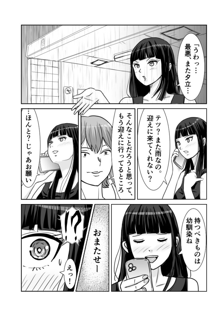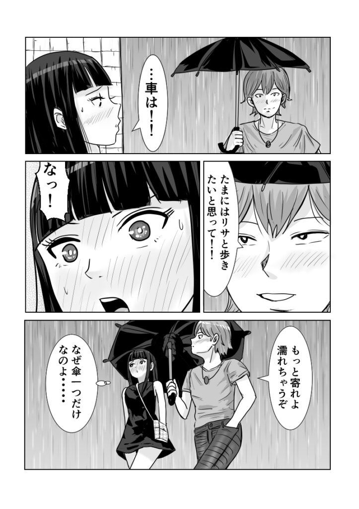 ショート漫画突然の夕立で迎えを頼んだリサ。現れたテツは車ではなく傘を差していて――「リサと相合傘で帰りたい」と告げられ、思わず赤面する。